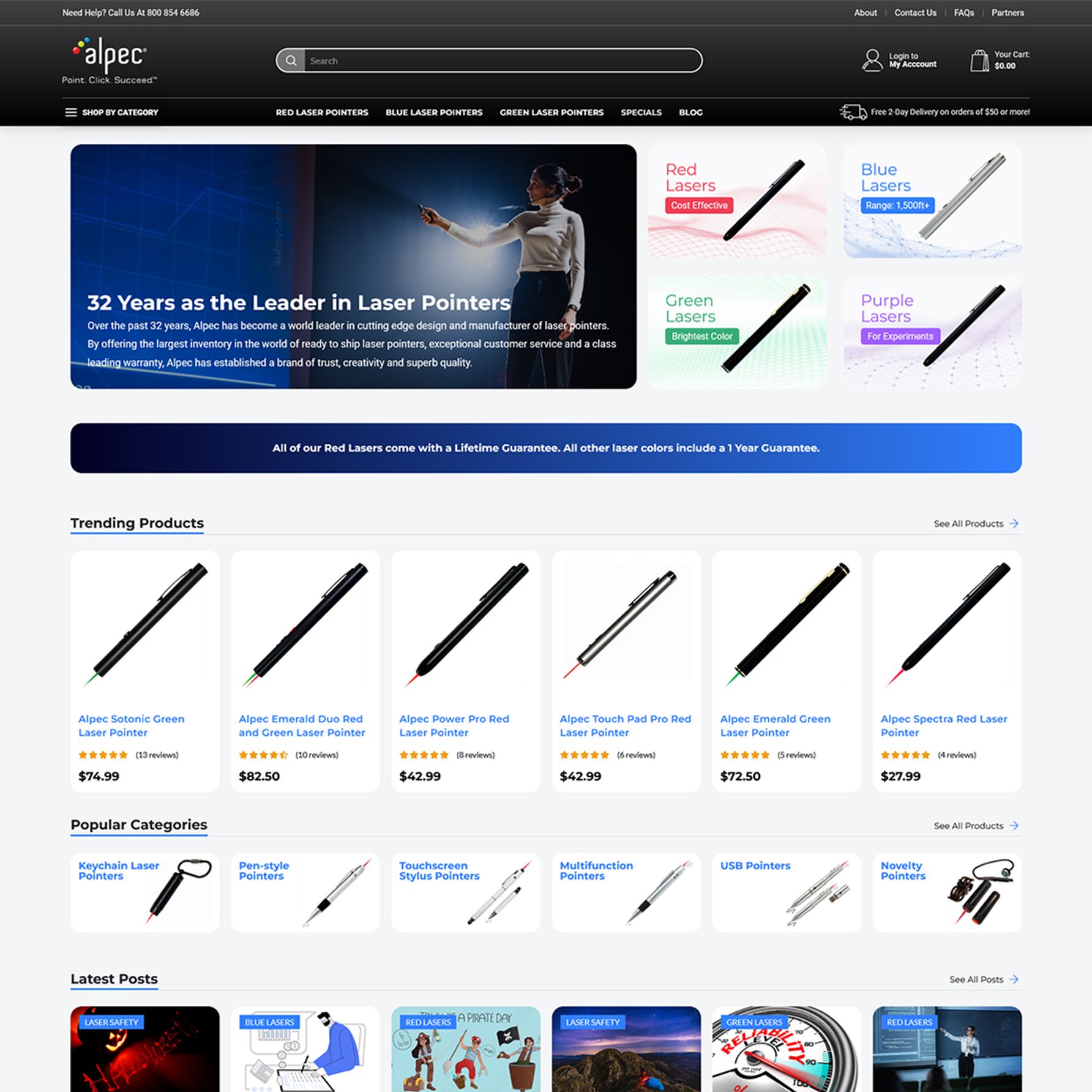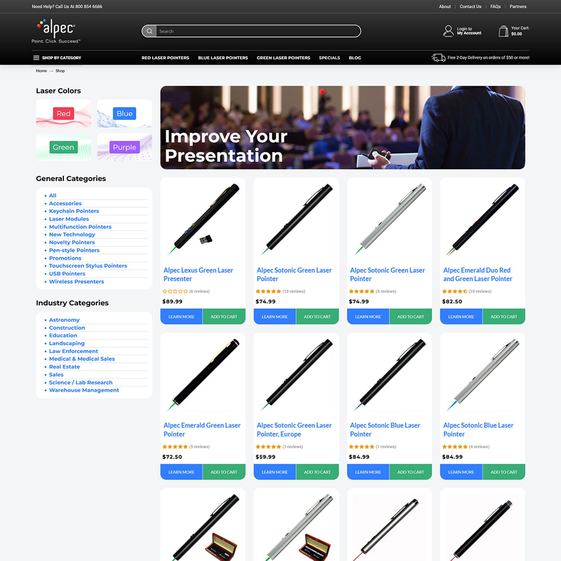 Alpec is a longtime leader in laser pointer manufacturing with more than 32 years in the industry and the world’s largest inventory of ready-to-ship laser pointers. While their product line and customer service were top-tier, their outdated eCommerce platform was holding them back.