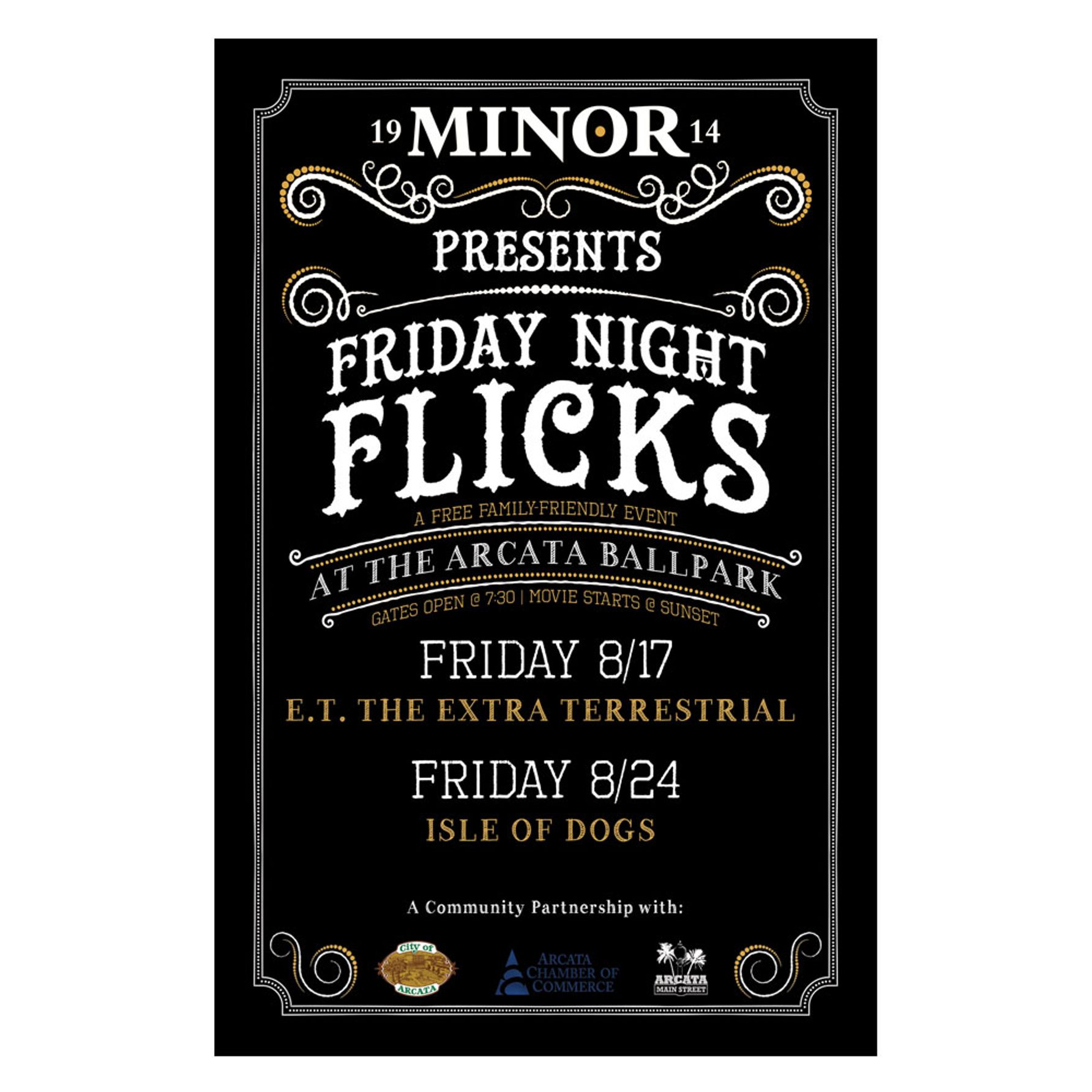 The Minor Theatre, a historic cinema in Arcata, CA, created Friday Night Flicks—a free outdoor movie series at the Arcata Ballpark—to give back to the community and reignite the spirit of classic open-air cinema. To support the event’s success, they needed eye-catching flyers that would capture the magic of the experience and drive local attendance.